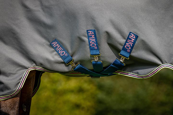 The Amigo® Bravo 12 Plus Horse Turnout is a waterproof and breathable blanket. Made from a strong waterproof and breathable 1200D polyester outer, polyester lining and fiberfill inside for warmth. Now with our patented V-Front closure and cut to our surefit neck design, gorgeous colors, and in a lightweight option for warmer weather. Incorporating our leg arches with cross surcingles, shine enhancing polyester lining and a detachable hood as standard.
