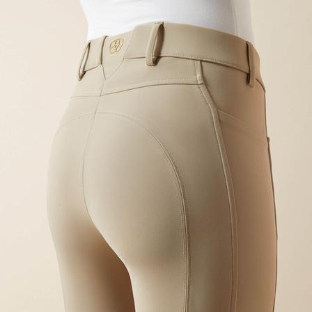 waistband uses an innovative elastic panel to provide close fit, stretch, and recovery, adapting to a rider’s varying hip angles. - Knee patch Ariat® Silicone Grip has a textured surface that helps you stay securely in the saddle.
