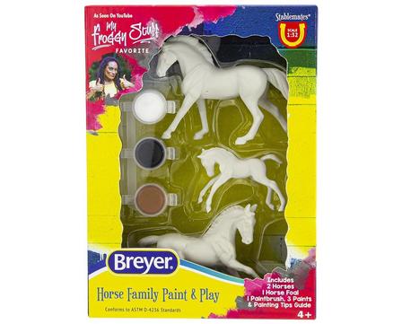 Create your own horse family with this fun kit! Good for beginners, yet challenging enough for more experienced painters. This fun set contains 3 Stablemates: mare, stallion, and foal; 3 paint pots; 1 paintbrush; and 1 instruction booklet. Everything you need for an entertaining, indoor activity!