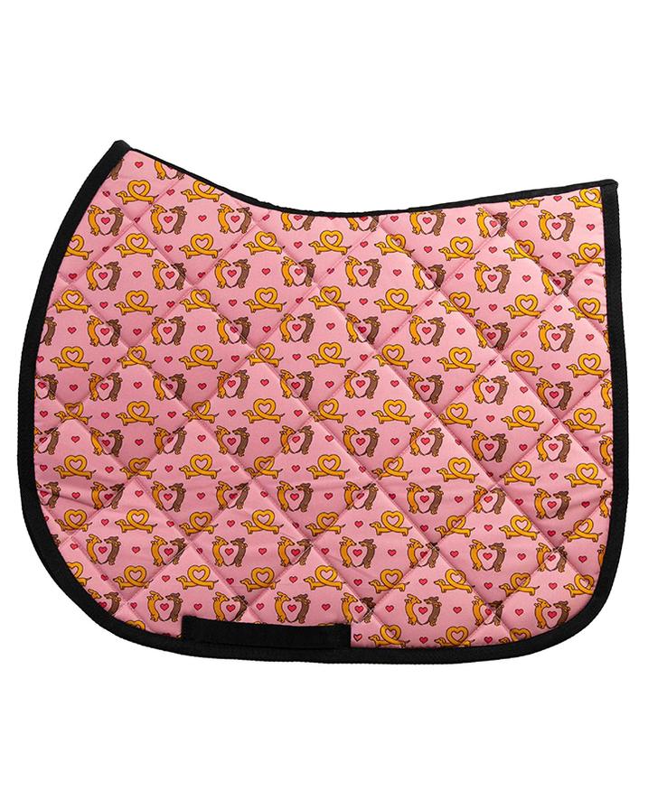 This squishy, cushioned saddle pad is contoured around the horse's withers to help alleviate pressure while riding. Silly printed patterns on the outside, with a mesh underside to keep your horse cool during exercise.