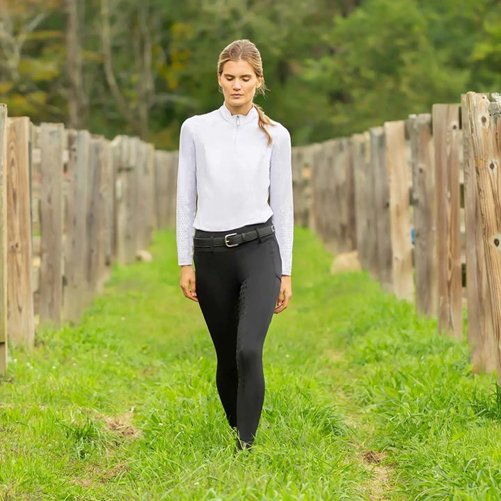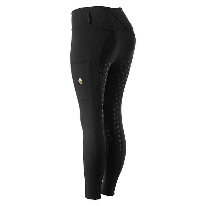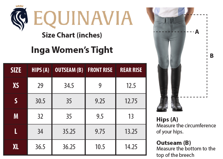 The Equinavia Inga Women’s Fusion Full Grip Tights provide the best of both worlds: the performance and polished look of breeches with the comfortable fit of tights. Designed with a modified high-rise waist and crafted from a polyester-elastane blend, these tights offer four-way stretch for complete freedom of movement. A 3/4 silicone seat with the Equinavia logo ensures superior grip in the saddle, while decorative faux back pockets and belt loops add a stylish, traditional touch. The silicone grippers at the inner hem help keep the tights securely in place, making these an ideal choice for active riders seeking function and style.