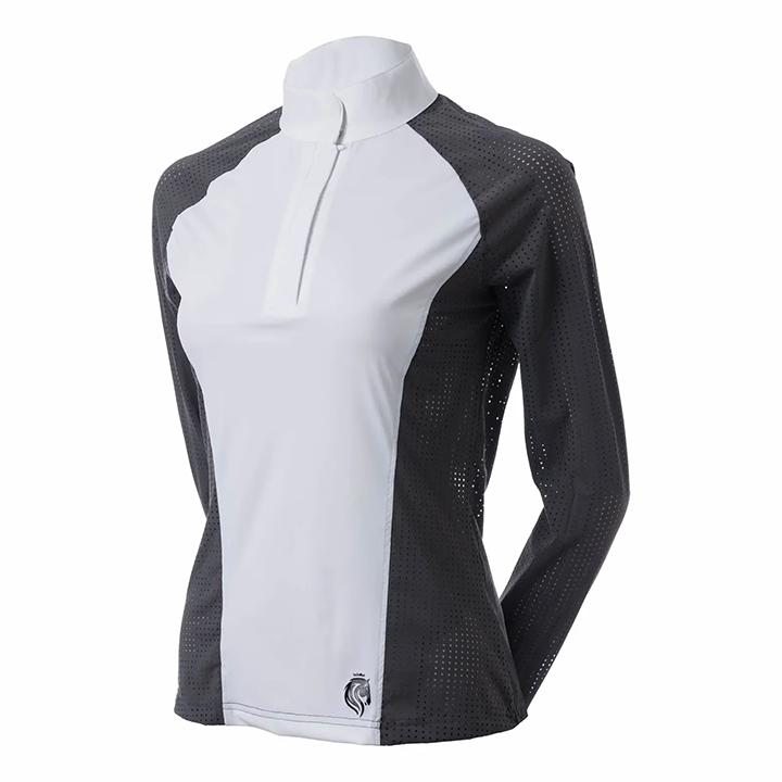 The Equinavia Sara Women’s Perforated Long Sleeved Show Shirt combines style and performance with breathable perforated fabric on the back and sleeves, ensuring comfort during long show days. The smooth poly blend front in optic white features a flattering curved seam pattern, while a covered 1/4 placket and hidden snap collar complete the traditional, show-ready look. The white cuffs, equipped with hidden snaps, add a polished finish.