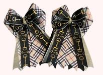 Add a refined, classic touch to your show-day look with these elegant horse show bows. Featuring timeless black and tan plaid paired with gold bit accents on sleek black ribbon, this design is elevated with a rich gold ribbon for a subtle hint of shine. Complete with a secure clip for a dependable hold, these bows stay neatly in place while adding a polished touch to your competition turnout.