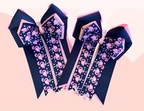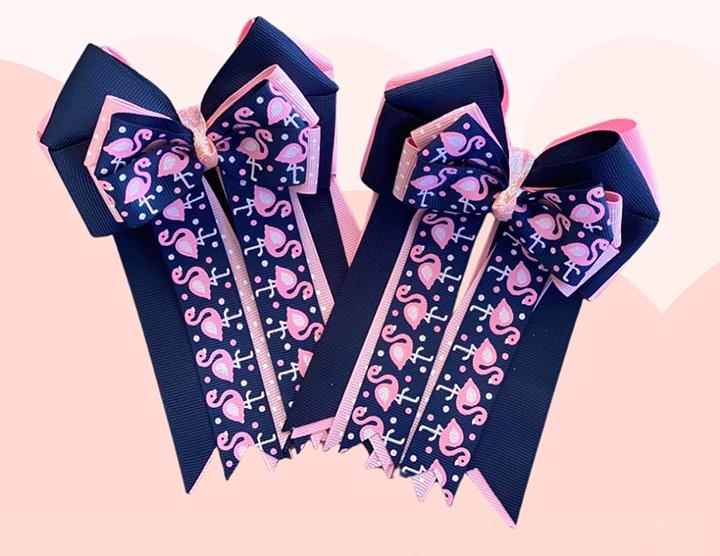 Add a fun, tropical flair to your show-day look with these charming horse show bows. Featuring a playful flamingo print ribbon paired with classic navy blue and bright pink accents, this design is both vibrant and polished. Finished with a secure clip for a dependable hold, these bows stay comfortably in place while adding a cheerful, eye-catching touch to your competition turnout.