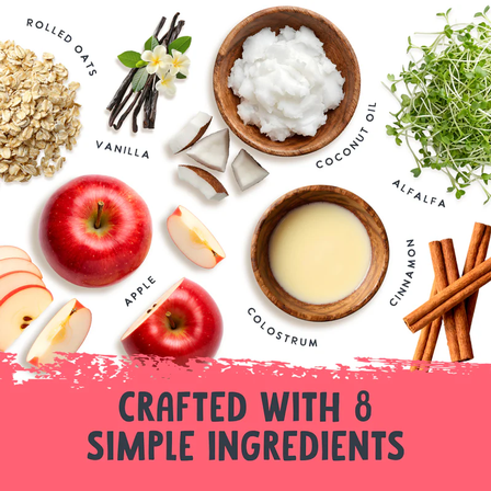 Ingredients: Oat Flour, Rolled Oats, Alfalfa, Coconut Oil, Apple Puree, Colostrum, Cinnamon, Vanilla