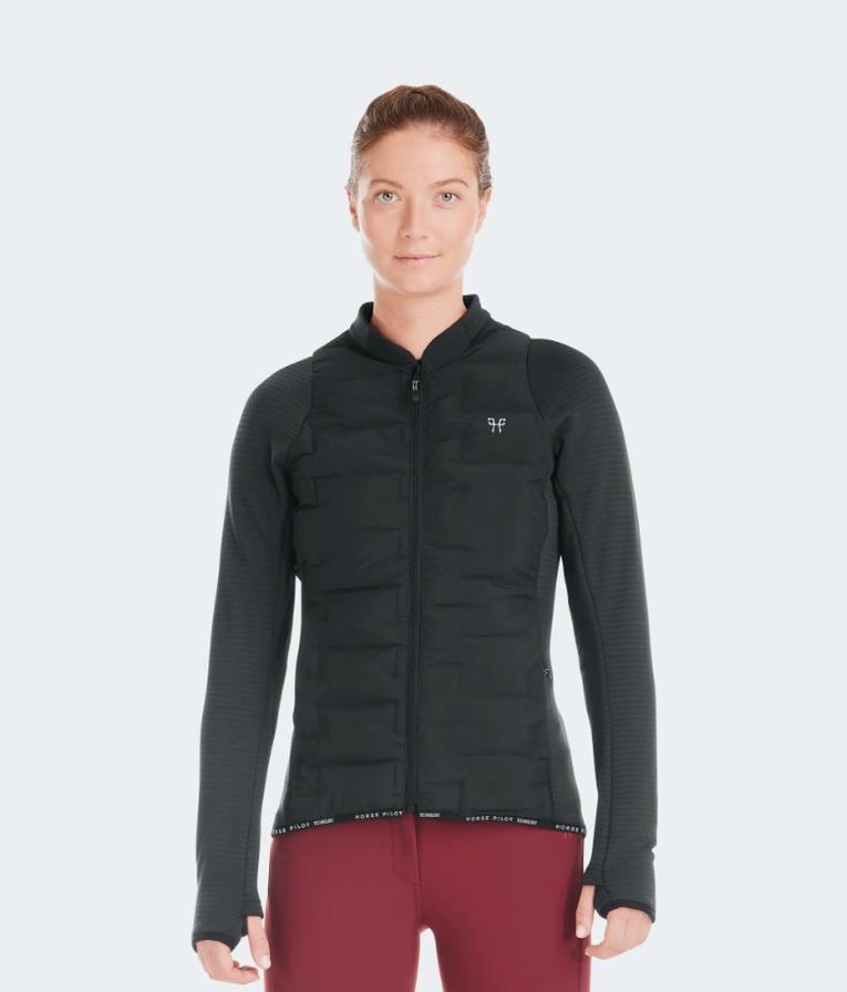 With a mix of quilted and fleece panels, the Storm jacket is the perfect middle ground between breathability and warmth. Pre-baffle panels on the chest and back provide warmth based on the body’s needs. This technique is achieved by weaving, which keeps air from penetrating the material. A lightweight, highly breathable fleece mesh on the sleeves, sides, and lower back provides optimal comfort. Laser perforations on the sides increase the jacket’s breathability. And because eco-friendly design is a core value for us at Horse Pilot, we have chosen responsible materials: fleece made of recycled yarn, pre-baffle OEKO-TEX 100® certified with a DWR treatment that is guaranteed PFC free.