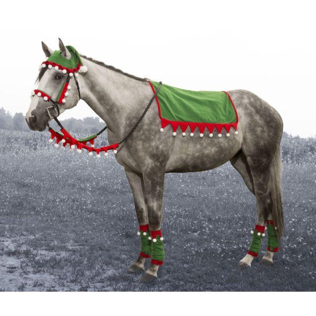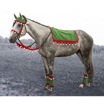 Celebrate the holidays with your horse! This green and red felt horse wear set is perfect for parades or festive photoshoots! Each piece is easy to attach with strong “Quick Grip” closures. Set includes 1 English saddle pad cover, 4 leg wraps, 2 rein covers, horse elf hat, and a 3-piece halter cover set. Fits most average horses.