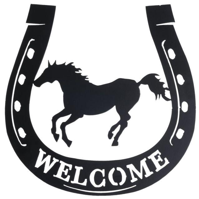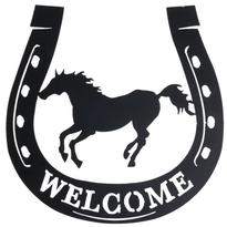 A great welcome sign for any horse lover! Perfect for hanging in the entryway to your house or barn. Made of metal with galloping horse design.