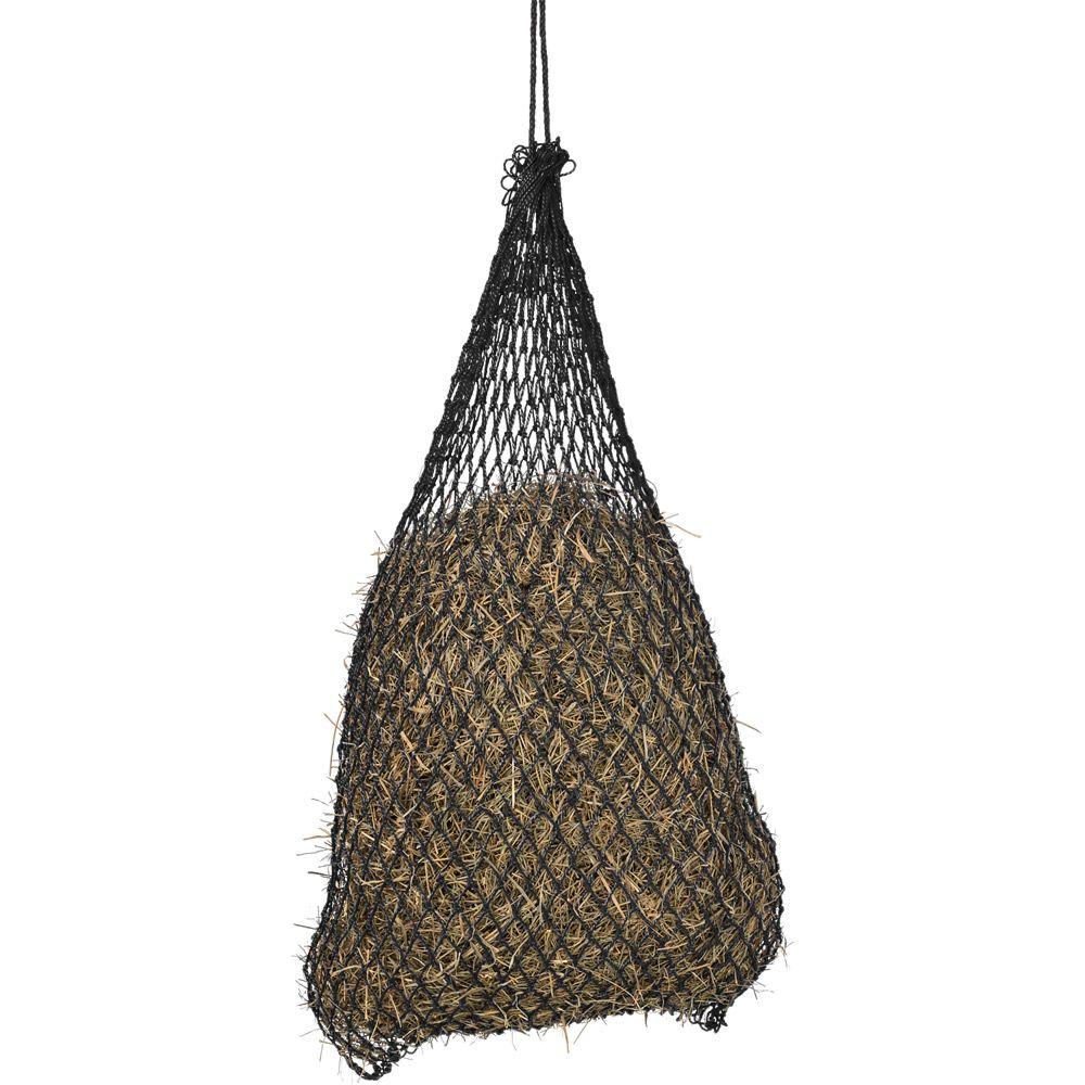 This large slow feed hay net holds up to a half bale of hay (standard 2-string bale) to keep your horse busy at home, at the show or at the campground. It is made of durable poly cord that is tightly knotted to prevent stretching. The 1.5" x 1.5" openings slow down consumption for a healthier and more natural feeding experience while also helping to reduces hay waste.