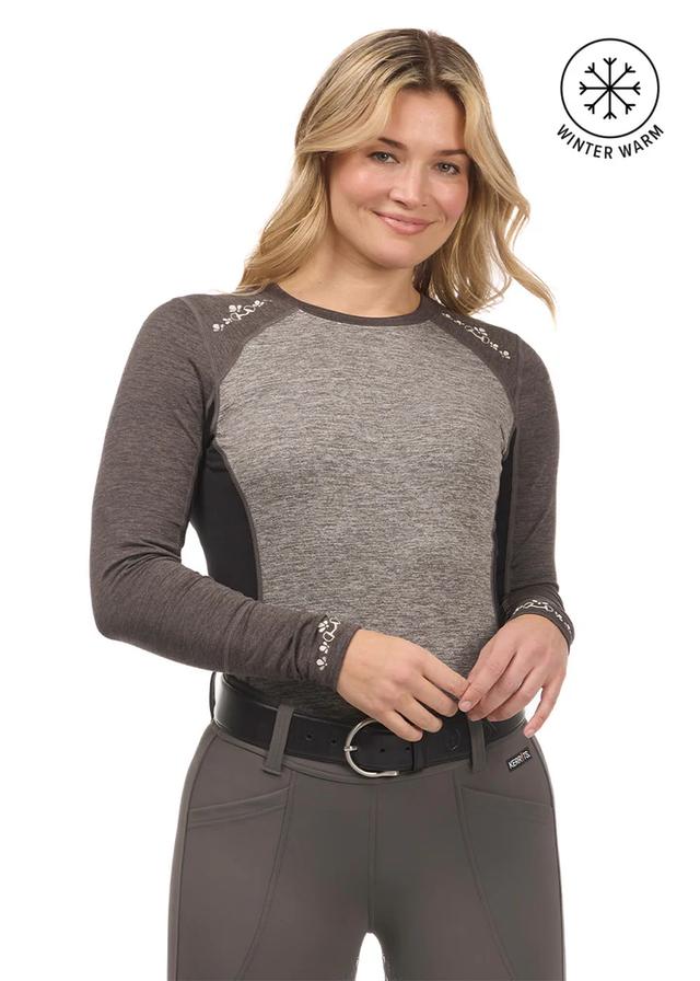 This lightweight, stretchy long sleeve base layer top features Kwikwarm™ technology to harness body heat for warmth, while quick-drying, anti-microbial fabric ensures comfort. Raglan sleeves and flat-seam construction provide a flattering fit, with Coolpass™ panels managing moisture in high-sweat zones. A subtle floral design on the shoulders and cuffs adds a “bit” of equestrian flair.