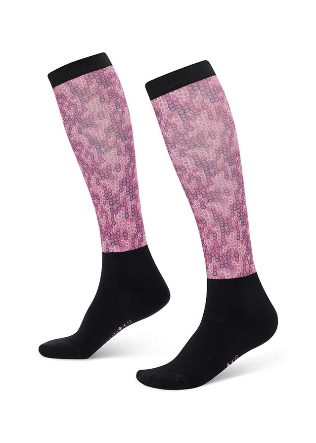 A staple equestrian tall boot socks with two technical fabrics for area specific functionality. Breathable and wicking, the lightweight microfiber fabric calf slides effortlessly into a tall boot and features exclusive equestrian prints for a touch of style and fun. A cotton-blend, cushioned foot bed with arch support keeps feet comfortable, protecting them from interior boot edges.