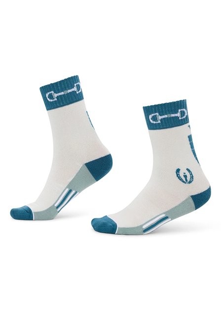 Kids paddock socks with snaffles and colors that coordinate with favorite Kerrits layers built to keep little feet happy, even if they have to chase a wily pony for miles. Super comfy, soft cotton blend socks. Mid-foot compression supports feet. Ankle padding prevents rubs. Strategic venting boosts breathability.