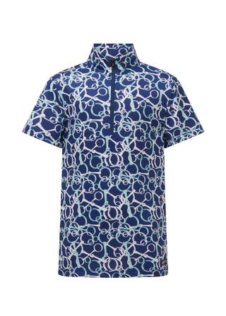 Kerrits lightest weight, UPF+30 kids short sleeve riding shirt that brightens summer rides with fun prints designed to celebrate their pony passion. From bold white horses on black to a million tiny snaffles in a sea of blue, these prints hide dirt while covering them in cooling, sun shielding Ice Fil® technology. Long zip controls ventilation.
