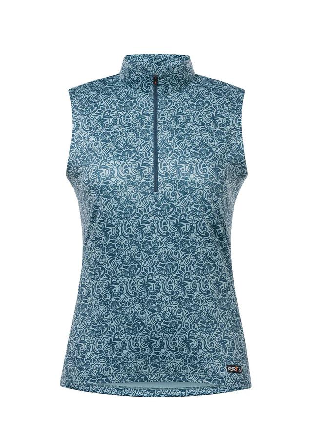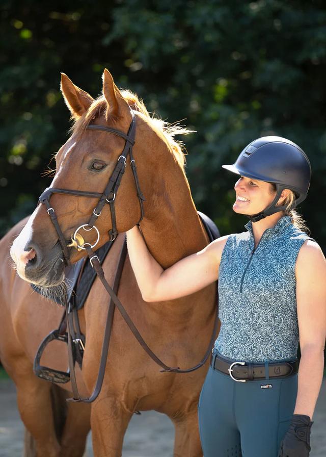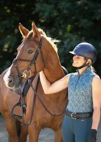 Look cool, feel cooler in this breathable, sleeveless printed riding shirt with a ten-inch zip collar for added ventilation. Coolcore® fabric uses 360° moisture movement technology to disperse sweat naturally, keeping you cool and dry through your ride. The refined tonal prints offer a flattering, elevated look while cleverly camouflaging barn dirt, and the equestrian-shaped hem is longer in back so your shirt stays tucked in while riding.