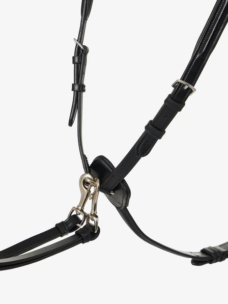 The padded cushioning behind the connector on the chest adds to the comfort for the horse, featuring a removable running martingale attachment with handy clips, durable metal fixings and easy to use buckle closures. The custom designed martingale rings clip on and off reins easily without the need to undo them.