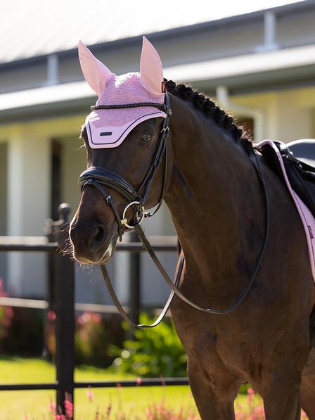 LeMieux's premium Essence fly hoods are made with protection and style in mind. Designed for pro riders, they are the ideal way to top off your Essence look for training. The 100% cotton crochet veil is crafted in handmade four-way stretch crochet with a smooth, softshell patch and a tie-down loop on the underside. This makes it unflappable, secure and close-fitting under the bridle. The veil is finished with sporty matte silicone print branding. The face veil is complemented with soft, comfortable elastane ear fabric, designed to protect your horse's ears from flies, dust and distractions.