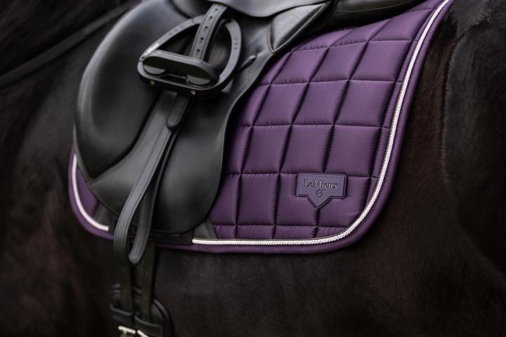 The textured PU leather girth protection area is complimented by an embossed logo and carries the usual signature LeMieux lower girth strap with its inner locking loops. The piece de resistance of the Loire Dressage Square is its unique metal badge on a leather mount in the lower back corner.