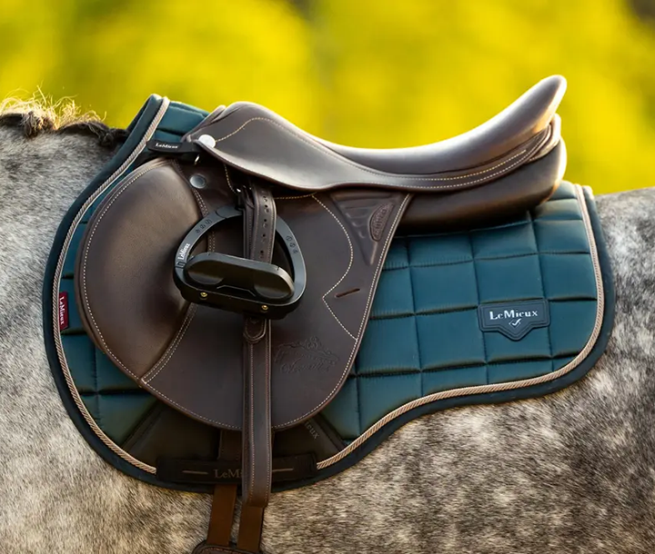 The textured faux leather girth protection area is complemented by an embossed logo and carries the usual signature LeMieux lower girth strap with its inner girth loops. A unique LeMieux logo metal badge mounted in the lower back corner provides a luxurious finishing touch.