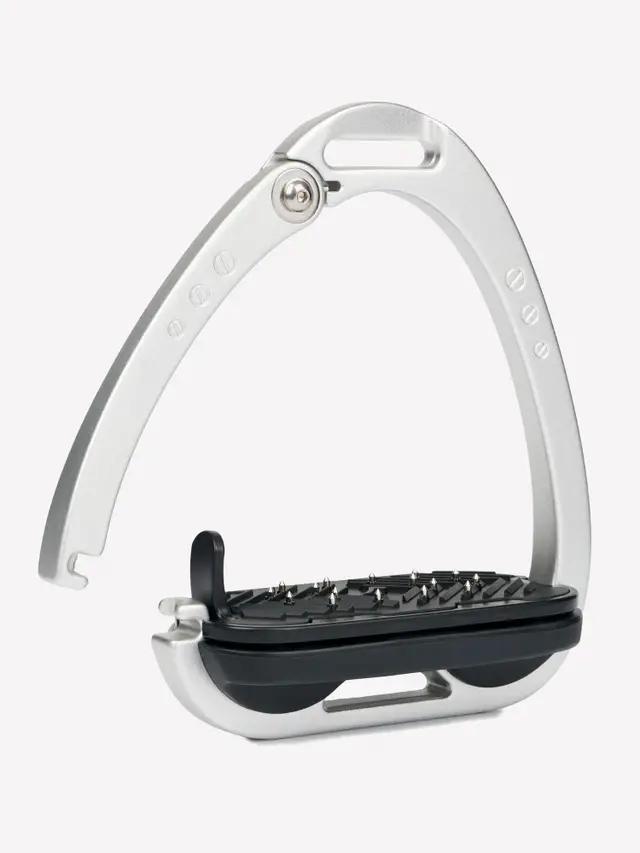 The footplate is supported by a twin-balance arch system that distributes the weight evenly across the base of the stirrup frame. The apex of the frame is recessed and off-set, encouraging a 45° outward orientation which makes it easier for the rider to locate the optimum angle for the foot and regain a lost stirrup.