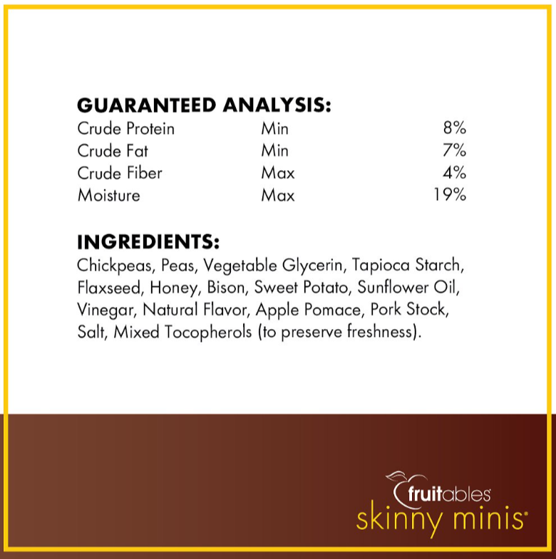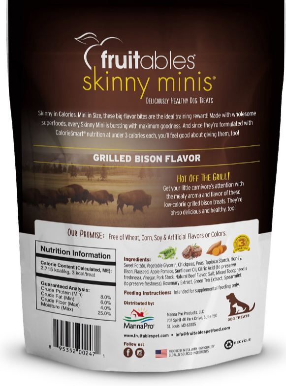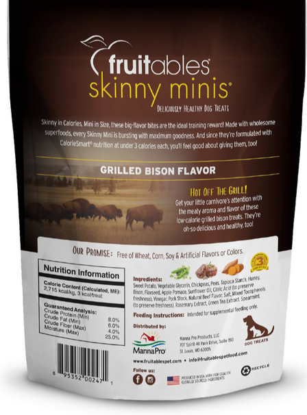 Open a bag of Fruitables treats and you will immediately smell the difference. At Fruitables, they make treats that taste as good as they smell. The smell of a big thick bison steak grilling over an open flame will get your little carnivore's attention. These Skinny Minis combine that same great taste & aroma in a calorie smart recipe that is perfect for everyday treating. Fresh from their certified organic bakery,