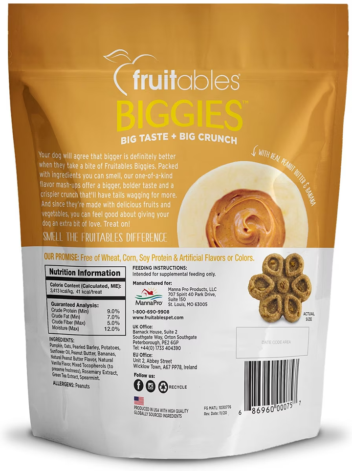 Even our four-legged friends enjoy the delicious, creamy taste of peanut butter. Fruitables pb n' joy treats combine real peanut butter with healthy fruit for a soft, chewy, protein-packed treat your dog will love. Perfect for an after-walk energy boost or split and share with other dogs to provide a little more pep in their step.