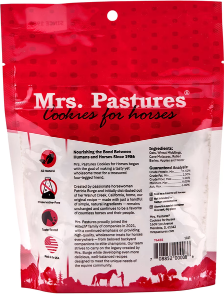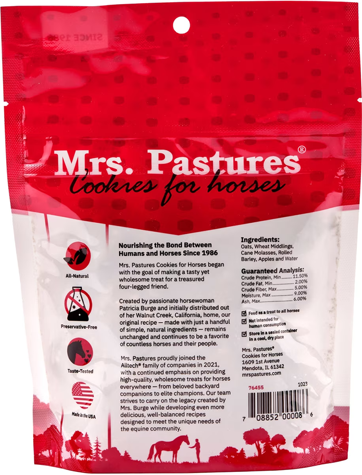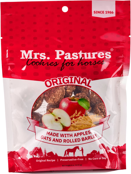 Made with all-natural, simple ingredients, Mrs. Pastures horse cookies were made to help nourish the human-horse bond. Originally designed with picky eaters in mind, try using them in your next training session — these special snacks have helped improve ground manners, trailer loading, mounting block patience and more!