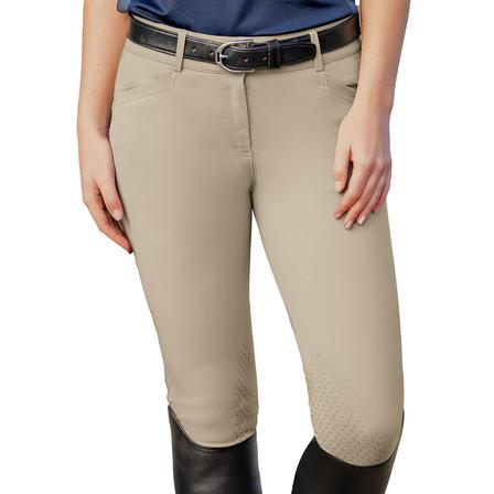 A sophisticated breech with silicone details for added security in the saddle. Understated and beautiful details. Technical and breathable 4-way stetch fabric is moisture-wicking for all day comfort. Mid-rise offers more coverage. Jersey sock bottom adds comfort under your tall boots.
