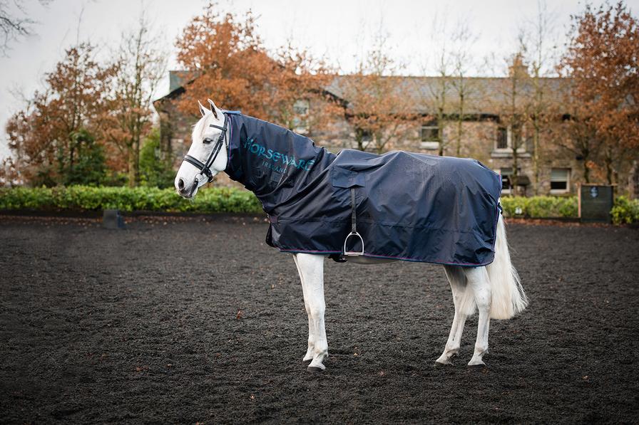 - It has an integrated neck cover, stirrup slits and belly strap, ideal for use on rainy show days.