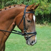 If you are looking for a classical cavesson noseband, with a refined look, the Levade Dressage Bridle is ideal. The Levade features a 1” padded round raised noseband, with a 3/4” matching browband, 5/8” cheek pieces, and a padded, contoured headstall. Comes complete with 3/4” Dressage Reins (plain leather reins with stops). This bridle is made of the best Grade A Sedgwick’s English leather. All hardware is stainless steel, buckle end, with a roller buckle on the noseband.