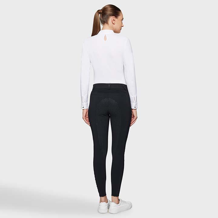Omega mid-rise women's riding breeches with grip. Ideal for riders looking for a sophisticated crystal style, these pants combine a second skin effect, resistance and performance for all disciplines.