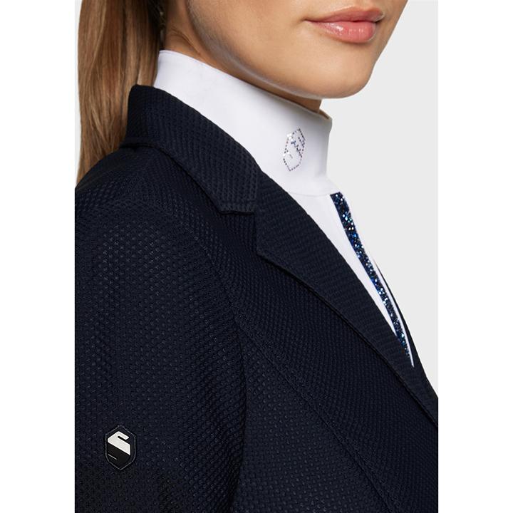 The finishes are subtle but refined: a Samshield metallic blazon on the shoulder, matte buttons on the front and an unlined design to maximize lightness and breathability. A discreet zip under the buttons ensures a fluid closure, while two flap pockets structure the line with sobriety.