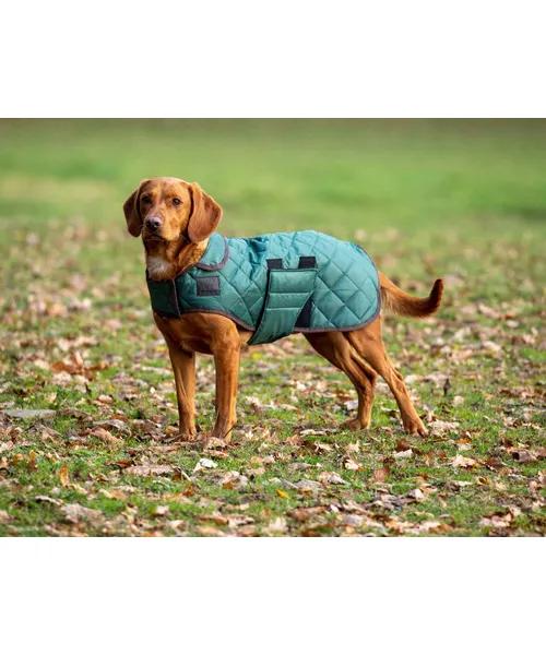 A super quilted dog coat for that country look finished with a smart trim. Cosy fold back collar, touch close chest fastening and belly flap, elastic hind leg straps. Harness compatible