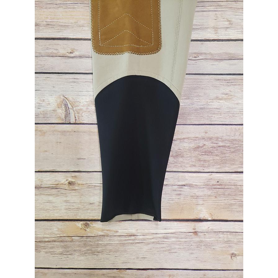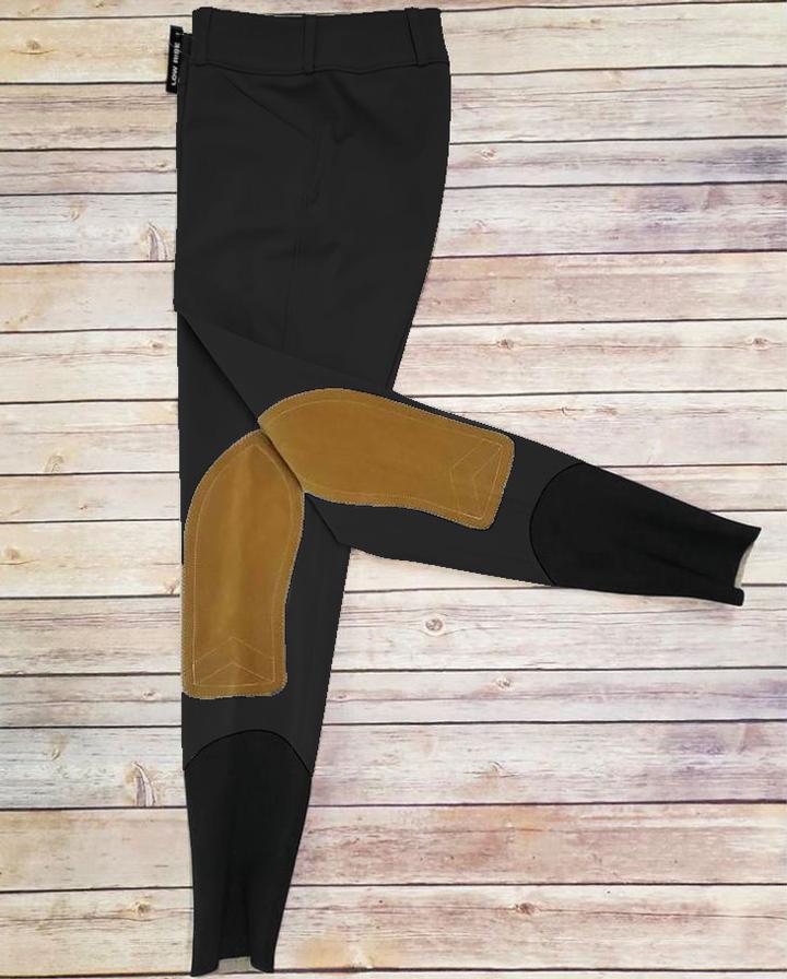 Low-rise, front zip, Euro seat breech in 73% cotton/20% microfiber/7% lycra 4-way stretch fabric with Clarino knee patches, wide waistband, Velcro ankle closures. Machine washable and made in the USA.