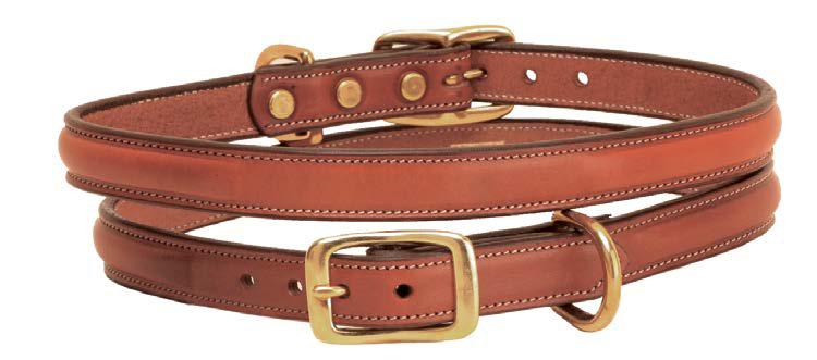 3/4” English bridle leather, round raised and stitched collar. Flat space for a nameplate. Brass buckle and Dee.