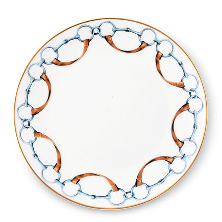 The Wellington Bit collection is a sleek twist on the iconic equestrian snaffle bit theme, taking it a step further into a striking Bone China dinnerware collection of polished sophistication. Whether tail-gaiting at the polo field or setting an elegant table for a formal dinner party, Vagabond House presents a statement of classic high style and is sure to garner attention and admiration. Fine Bone China was designed and hand-drawn by Vagabond House’s master artist Leesa Greenlee. Shiny Gold rimmed add a formal class and style to the 10.5 inch Dinner Plate.