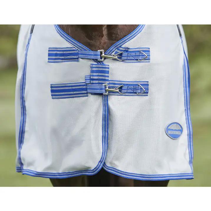 A great option for the sensibly blanketed horse that can be highly sensitive. The WeatherBeeta ComFiTec Airflow II Detach-A-Neck is a mesh sheet made to protect your horse in summer which features a soft and durable polyester mesh outer that is breathable and provides insect protection with 75%+ UV block and a Detach-A-Neck for versatility. Featuring an Ultra belly wrap and a full wrap tail flap that has a two piece design that wraps around the horse's quarter's, both of these features provide maximum protection. An Ezi-clip front closure with touch tape, is fast and easy to use, whilst the traditional side gusset allows for freedom of movement. 210T lined shoulders, mane and tail flap help prevent rubbing and elasticized, adjustable and removable leg straps help to keep the fly sheet in place.