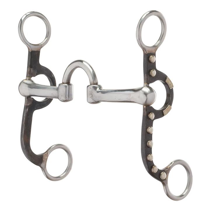 This antiqued bit features a 5" sweet iron polished low port correction mouth with copper inlay, 6" Argentine cheeks and German silver trim and dots.
