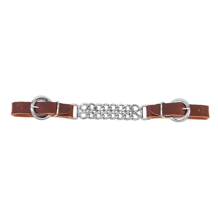 Heavy harness leather 5/8" curb strap is dipped in oil, dressed with butter and hand rubbed for the ultimate in performance and a rich golden chestnut color. Features a 4-1/4" double flat link chain for more contact and non-rust stainless steel hardware.