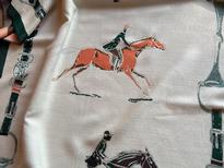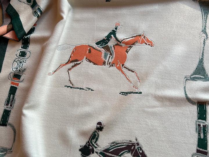 The Lady H gallops across this fanciful super soft scarf. She’s seen jumping, watching the field and even riding side saddle in her habit. The back of this scarf is just as pretty as the front and can be worn reversed. Outlined in large snaffle bits and leathers. Perfect après hunt scarf to match your tweed. Viscose blend. Size: 74” x 27”