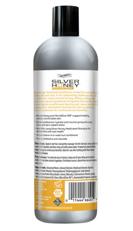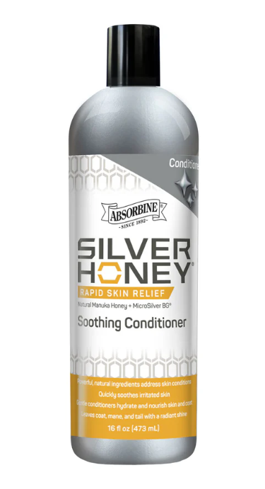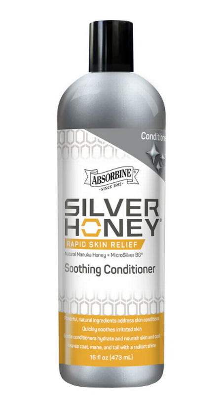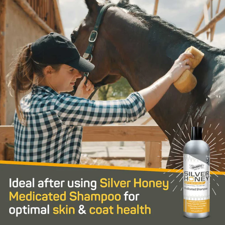 Silver Honey® Soothing Conditioner is the only equine conditioner powered by the healing strength of Manuka Honey and MicroSilver® BG, delivering targeted hydration and natural antimicrobial support to help soothe irritated, sensitive skin. This rich yet gentle formula deeply nourishes and conditions the coat, mane, and tail, leaving a radiant, healthy shine without added fragrance or harsh chemicals. Ideal for use after bathing or as a leave-in treatment, it helps support skin recovery, maintain coat health, and protect against bacteria, fungi, and yeast—making it the premium choice for equine skin and coat care. For best results, use with Silver Honey® Medicated Shampoo.