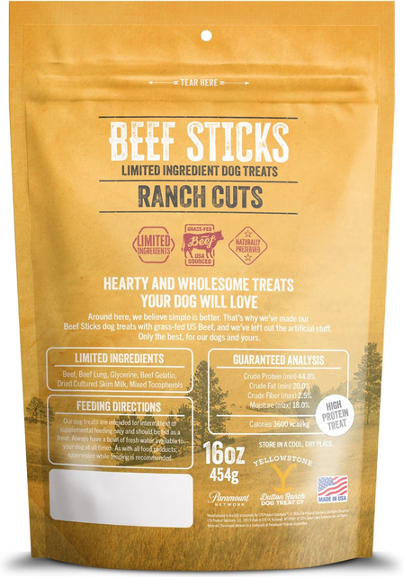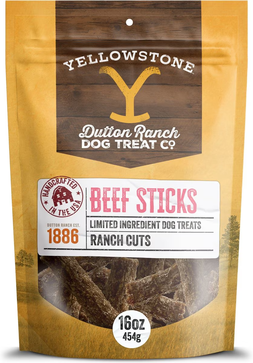 Treat your furry companion to the finest indulgence with Yellowstone Dutton Ranch Dog Treat Co. Ranch Cuts Beef Sticks Soft & Chewy Dog Treats. Inspired by the rugged grandeur of Yellowstone and the esteemed Dutton legacy, these treats are meticulously crafted to captivate the taste buds and hearts of your four-legged family member. This recipe features certified organic, humanely raised, grass-fed beef to create every morsel, ensuring that your tail wagger gets the best of nature’s bounty. Plus, they’re made with limited ingredients and free from byproducts, additives, fillers, or preservatives. Every treat embodies the spirit of the authentic Yellowstone. Dutton Ranch Dog Treat Co. invites pet parents to treat their beloved companions to something extraordinary because they deserve nothing less.
