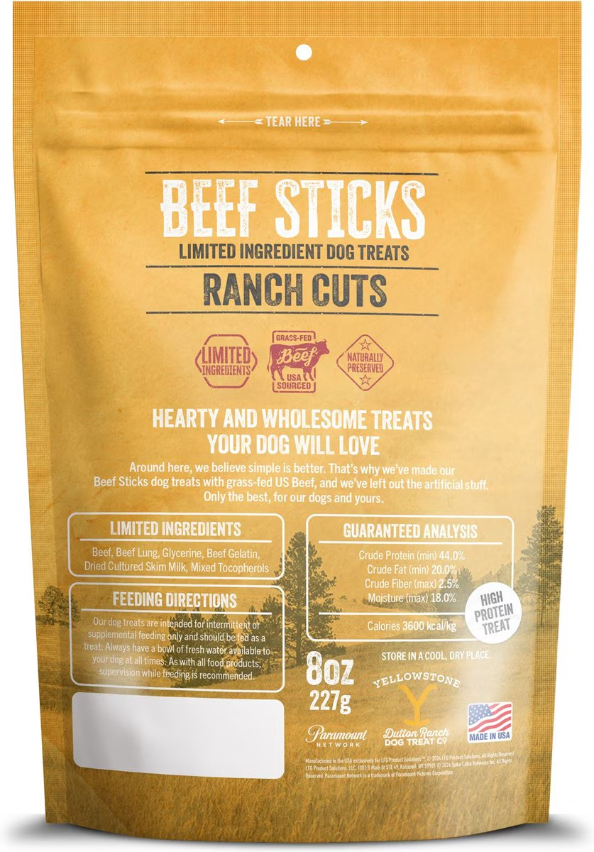 Treat your furry companion to the finest indulgence with Yellowstone Dutton Ranch Dog Treat Co. Ranch Cuts Beef Sticks Soft & Chewy Dog Treats. Inspired by the rugged grandeur of Yellowstone and the esteemed Dutton legacy, these treats are meticulously crafted to captivate the taste buds and hearts of your four-legged family member. This recipe features certified organic, humanely raised, grass-fed beef to create every morsel, ensuring that your tail wagger gets the best of nature’s bounty. Plus, they’re made with limited ingredients and free from byproducts, additives, fillers, or preservatives. Every treat embodies the spirit of the authentic Yellowstone. Dutton Ranch Dog Treat Co. invites pet parents to treat their beloved companions to something extraordinary because they deserve nothing less.