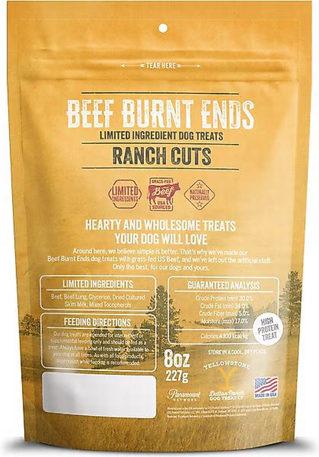 Yellowstone Dutton Ranch Dog Treat Co. Ranch Cuts Burnt Ends Soft & Chewy Dog Treats are the ultimate indulgence for your furry companion. Inspired by the rugged grandeur of Yellowstone and the esteemed Dutton legacy, these treats are a testament to an unwavering commitment to providing furbabies with the finest culinary experience. Made with certified organic, humanely raised, grass-fed beef, each treat is a celebration of nature’s bounty and a true taste of the untamed West. Plus, these treats feature certified organic and humanely raised beef and contain no additives, fillers, or preservatives. It’s just pure and natural goodness that your pup will love.